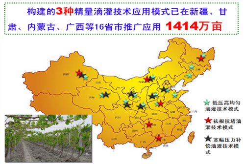 Focusing on precise drip irrigation technologies and products, IWHR experts have established a technical application mode that integrates a series of precise drip irrigation technologies guaranteeing low pressure and high uniformity, providing pressure compensation for broad width, and featuring root-avoiding and anti-clogging, which fit regional characteristics in China and have been promoted and applied to 14.14 million mu (about 2.33 acres) of land in 16 provinces and municipalities all over China, with their influence reaching nearly 30 million mu of water-saving farmland nationwide, direct economic benefits of 6.223 billion RMB and 29.778 billion m3 of water saved.