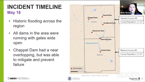 Two researchers from Argonne National Laboratory of US Department of Energy introduced the Michigan Dam failure in May 2020. Dr. Molly Finster reviewed the background of the whole incident and its main timeline.