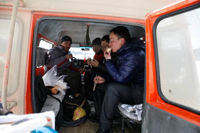 According to Professor Wang Tao, one of the team members, they usually stayed on the frozen river for a whole day. The only break they could take was a short lunch in the car with some scones, eggs and pickles. When the sun set, local workers and fishermen already returned home, while they still stayed on the river and continued their work in the afterglow.