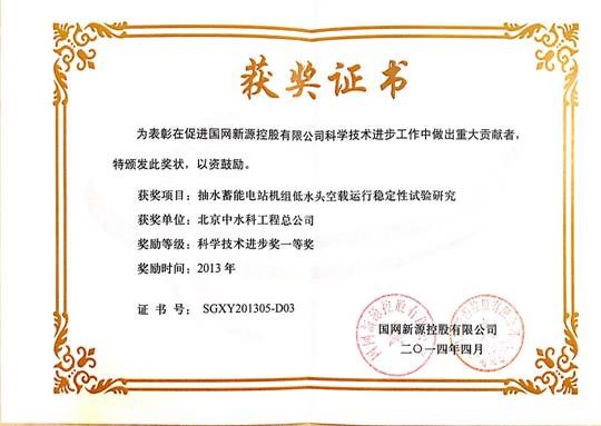 Beijing IWHR Corp. has undertaken the Experimental Research on Liability during Low Water Head No-Load Operation of Pumped Storage Hydropower Station, a project of the State Grid Xinyuan Company Ltd. The project passed examination on October 2013 and won the First Grade Price for Science & Technology Progress of the company.