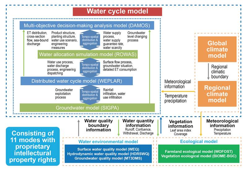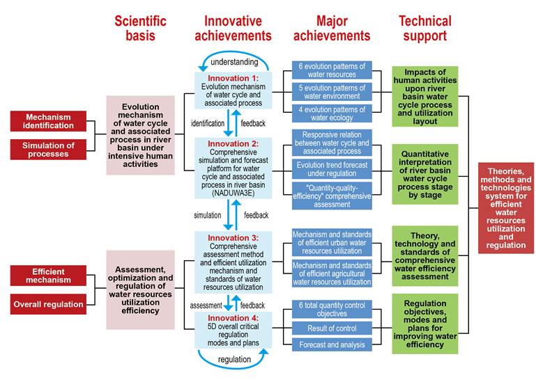 1) Based on the dynamic paradigm of natural-artificial dualistic water cycle, the comprehensive simulation model of dualistic water cycle in river basin and the associative processes (NADUWA3E) is developed. Through scaling and coupling integration, the comprehensive coupling simulation is realized of the three major systems (water cycle, water environment, and water ecology) of dualistic water cycle in river basin and the associative processes.